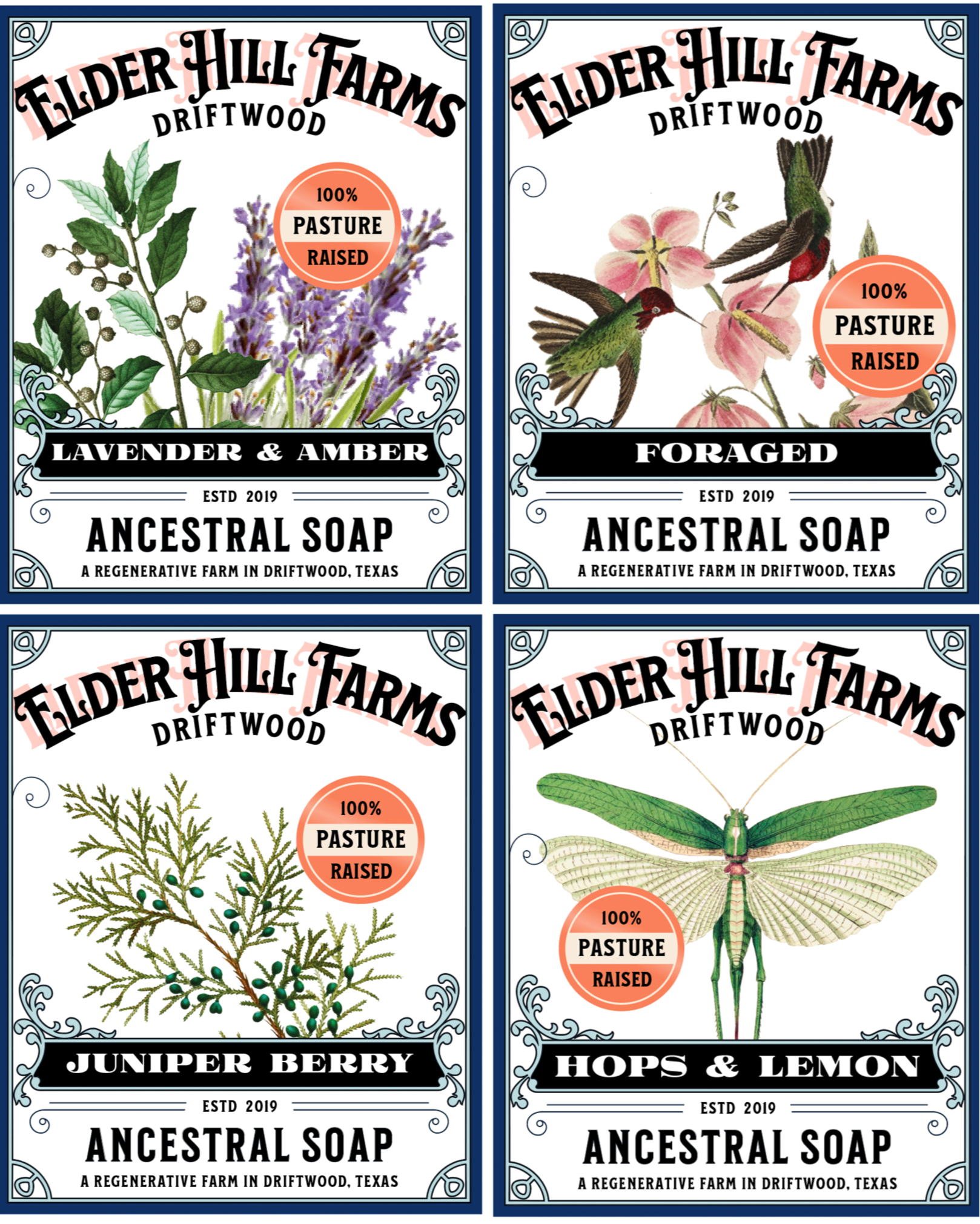 Featuring scents all crafted from Essential Oils. Made from home rendered lard and tallow sourced exclusively from Elder Hill Farms' and other local, organic, pasture-raised animals. Each bar is thoughtfully infused with aromatic scents that evoke the essence of heritage and nature. Ideal for those who appreciate expert craftsmanship and authentic ingredients, these soaps provide a rich, nourishing cleanse while also offering additional health benefits. Ideal for those looking for clean products rooted in time-honored practices.