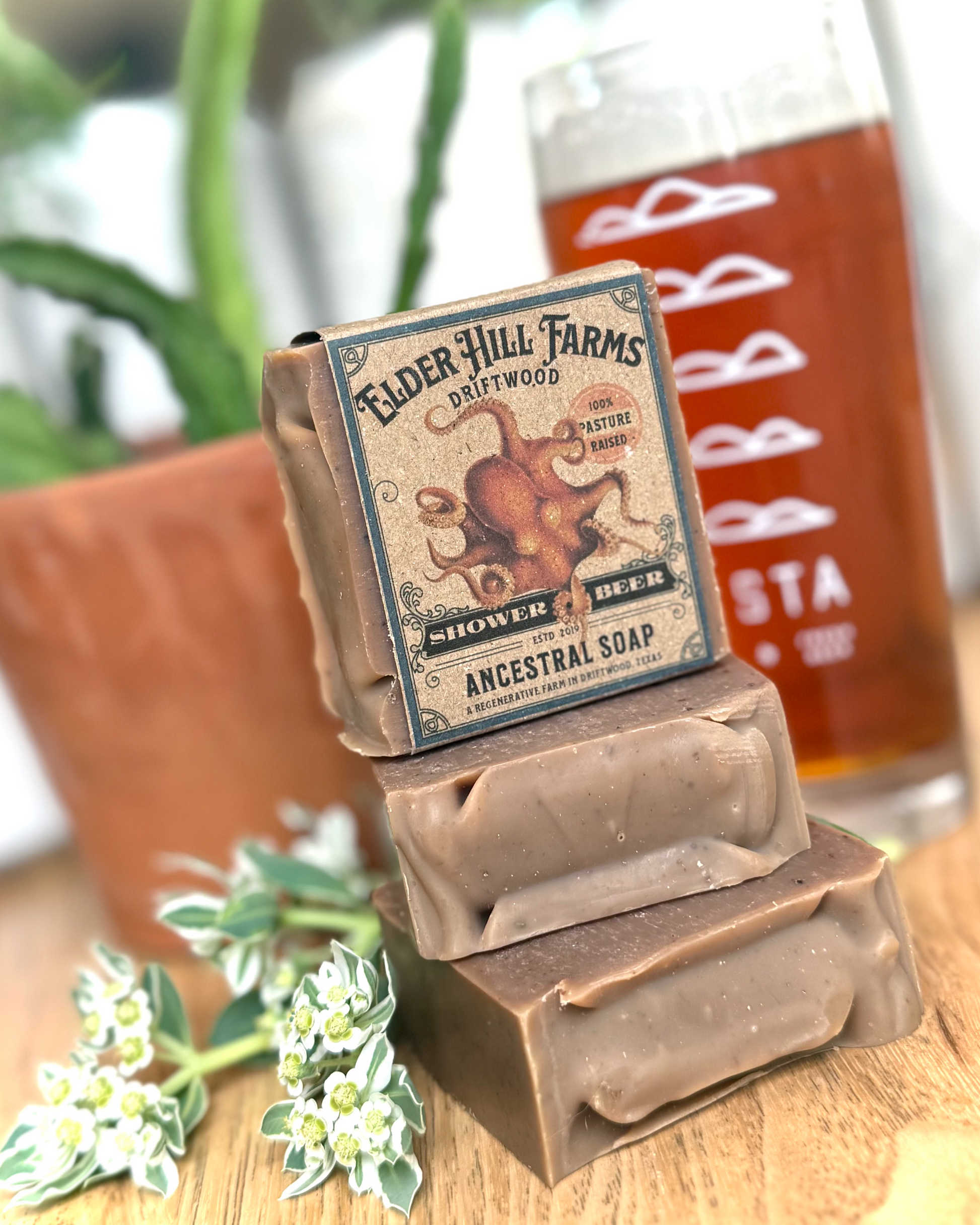 'Rotating Tap' Shower Beer: Each bar is a testament of our commitment to working with local businesses with the goal of Regenerative Agriculture in mind. Breweries are an amazing source of just this: spent grain for animal feed and beer for soap making. We've harnessed the natural benefits of beer – its rich vitamins, minerals, and amino acids – to create a soap that not only cleanses but also deeply nourishes and hydrates your skin. Inspired by the lively character of a refreshing brew, this soap features a captivating fragrance that dances between bright and earthy notes.